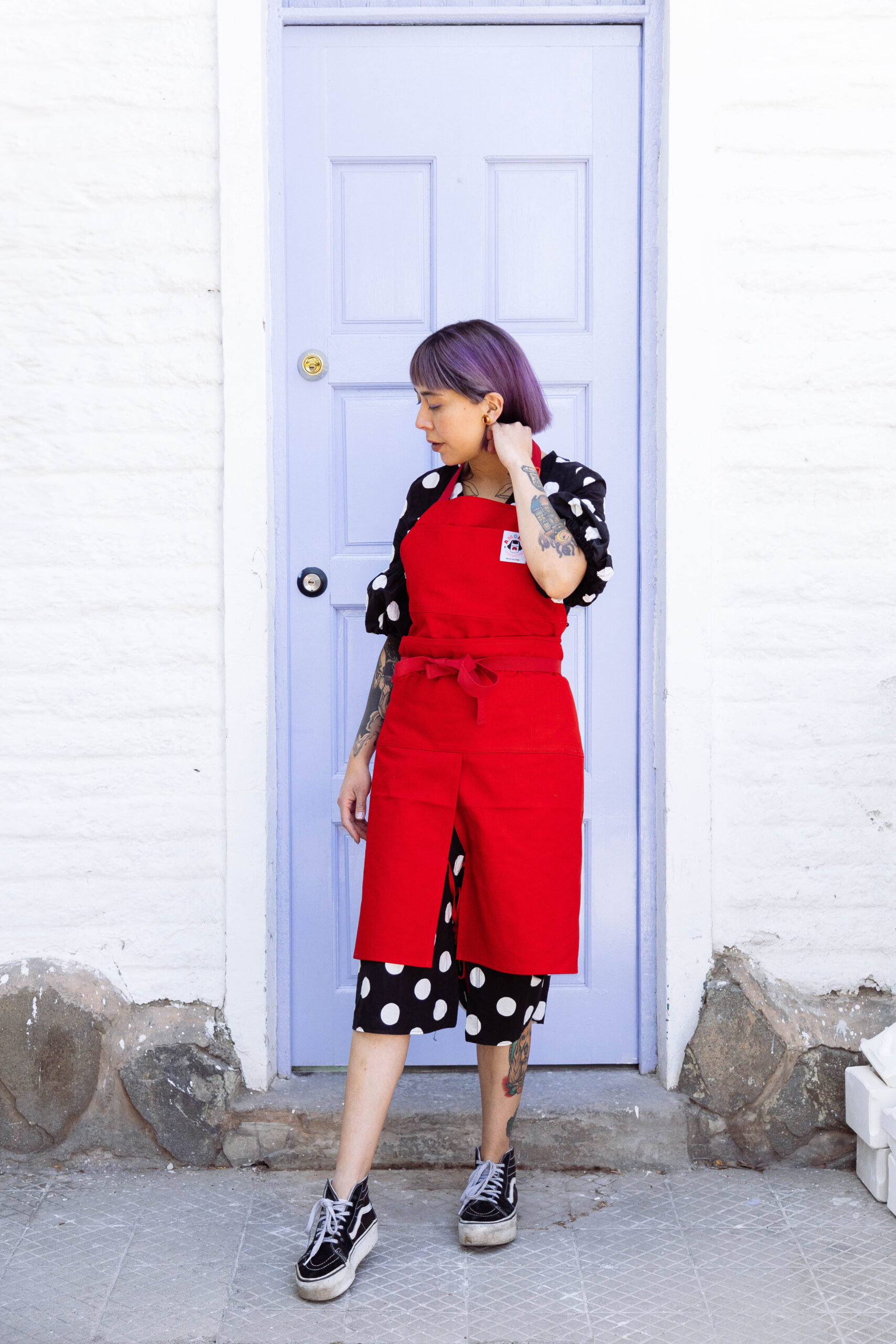La pechera está diseñada para adaptarse a distintos cuerpos y tallas, puedes usarla cruzando los tirantes para conseguir que quede más ceñida o bien atándolos en tu espalda. Puedes recoger el delantal plegándolo en la cintura si te acomoda que sea más corto o bien dejarlo de su largo normal.
